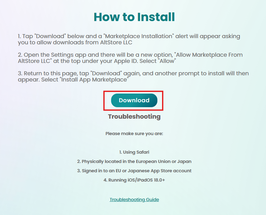 続いて以下のURLにアクセスし、画面中央の「Download」ボタンをクリックしてAltStore PALをインストールしましょう。