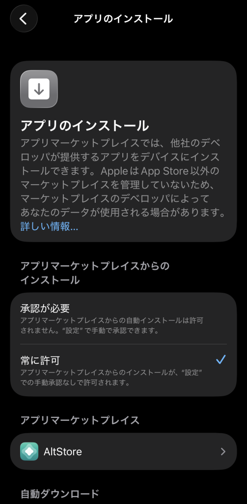 ※アプリマーケットプレイスからのインストールは「常に許可」にしておくと楽です。
