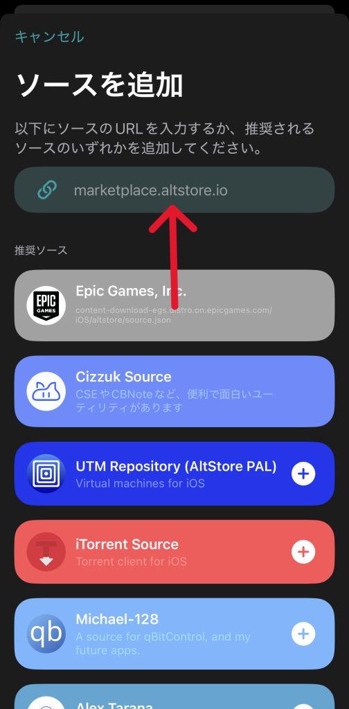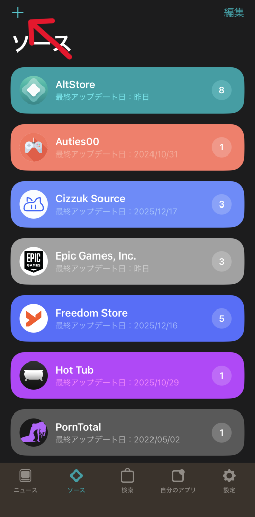 「ソース」ページに移動したら、右上の「+」マークをタップして、ソースURLを入力する画面に移動します。