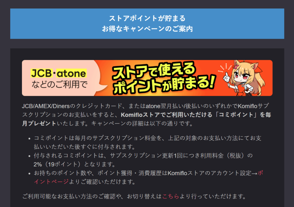 現在、Komifloでは読み放題サービスの月額料金をJCB/AMEX/Diners・atoneで支払うとKomifloストアで利用可能なポイントが付与されるキャンペーンを実施中です。